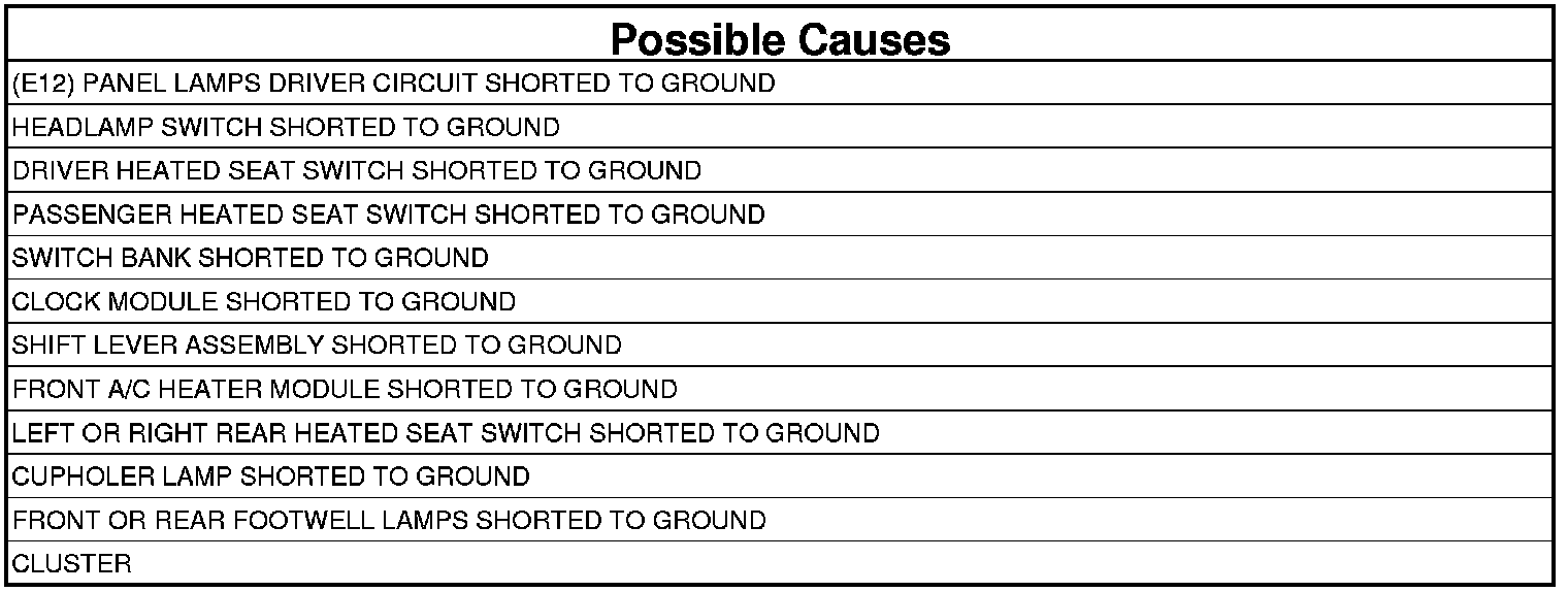 - Repair the (E12) Panel Lamps Driver circuit for a short to ground.