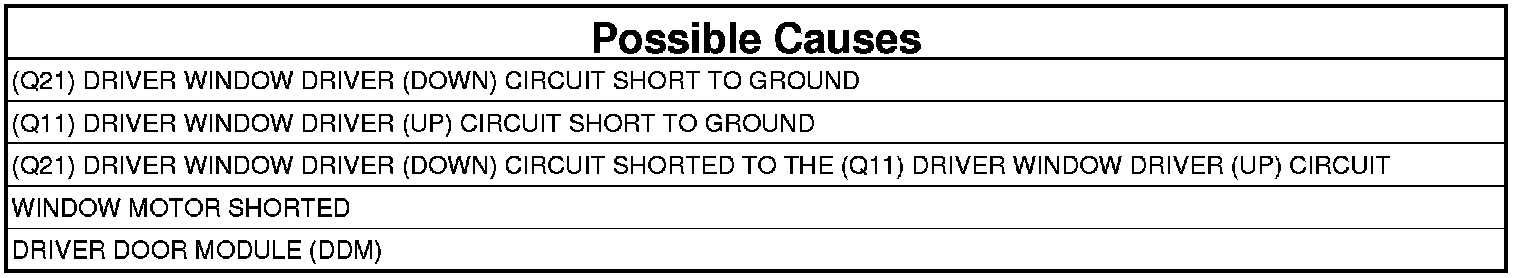 - Repair the (Q21) Driver Window Driver (Down) circuit for a short to the (Q11) Driver Window Driver (Up) circuit.