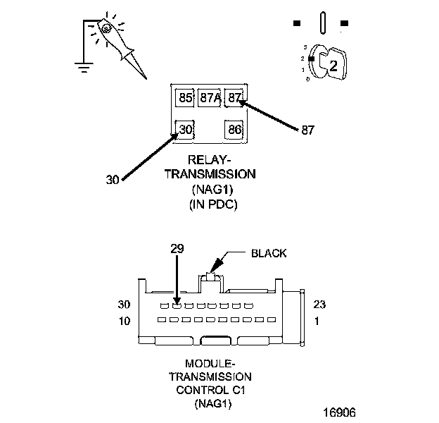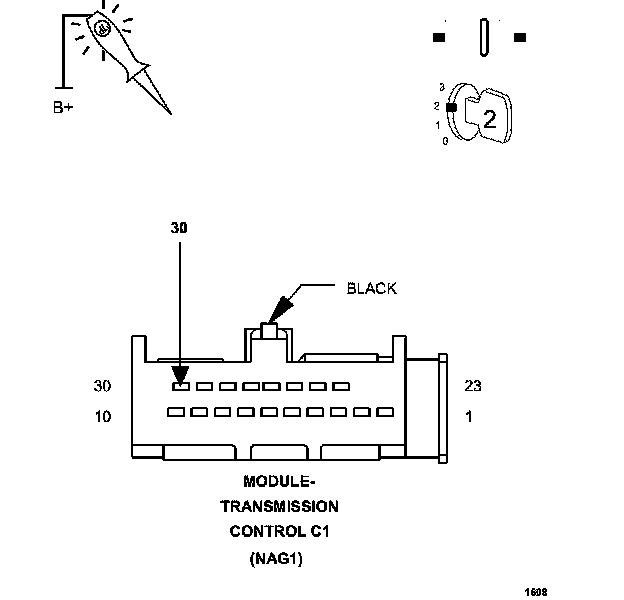 4. Using a 12-volt test light connected to ground, check the (A1) B (+) circuit in the Transmission Relay connector.