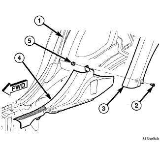 3. Engage the rear extension of the rear door scuff plate (4) under the lower C-pillar trim (Sedan) or quarter trim panel (Wagon) (3) on the quarter inner panel.