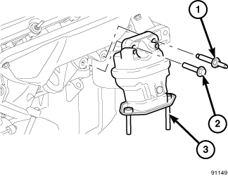 5. Lower engine assembly until engine mount studs (3) rest in frame perches.