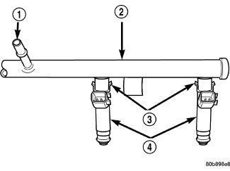 2. Install injector(s) (4) and injector clip(s) (3) to fuel rail.