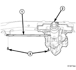 5. If equipped with electronic telescoping column, Install the screws (3) fastening the brace (1) to the steering column (2) and support beam bracket. First, tighten mounting screw at the column to 29 Nm (21 ft. lbs.). Then, tighten mounting screw at the support beam to 12 Nm (106 in. lbs.).