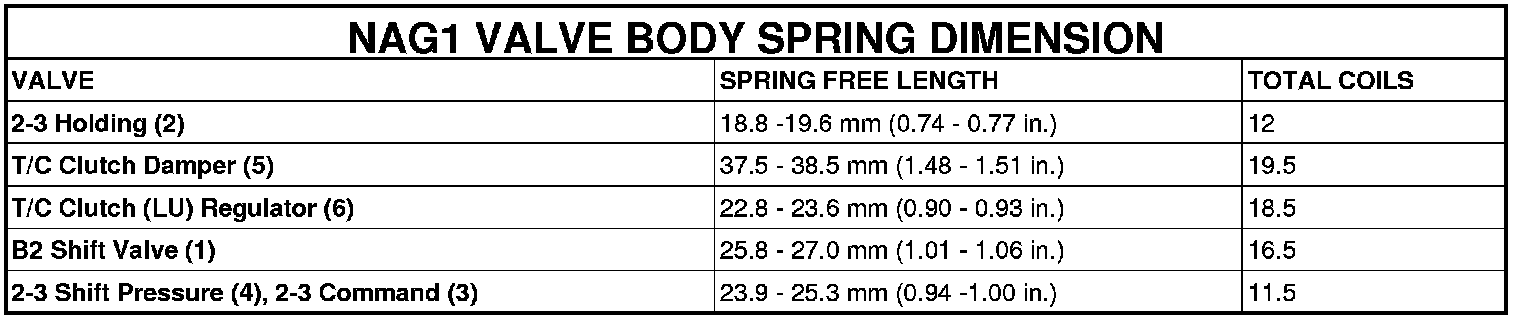 2. Lubricate and install the B-2 Shift Valve assembly (1), 2-3 Holding Pressure Valve assembly (2), 2-3 Command Valve assembly (3), 2-3 Shift Pressure Shift Valve assembly (4), TCC Damper Valve (5) if equipped and the T/CC Lock-Up Regulator Valve assembly (6) into the valve body.