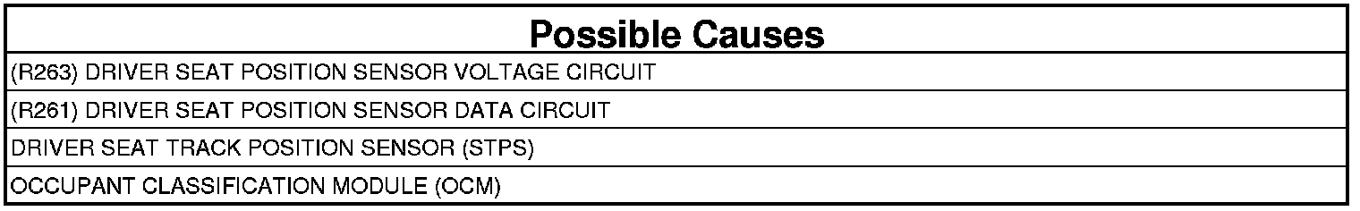 When powered, the CAN bus ignition status is IGN_RUN, and the Occupant Classification Module (OCM) is configured for a Driver Seat Track Position Sensor (STPS), the Occupant Classification Module (OCM) diagnoses the internal and external circuits to verify system performance. The fault occurs when the sensor value read by the OCM is outside the expected range (as specified by calibration) of a working sensor for 500 ms ± 110 ms.