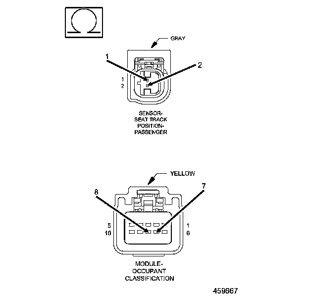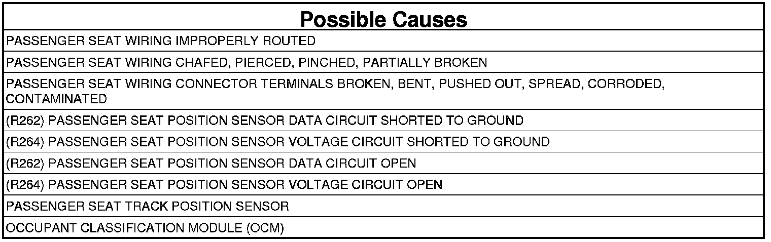 1. Using the wiring diagram/schematic as a guide, inspect the Passenger Seat wiring and connectors. Look for chafed, pierced, pinched, or partially broken wires and broken, bent, pushed out, spread, corroded, or contaminated terminals.