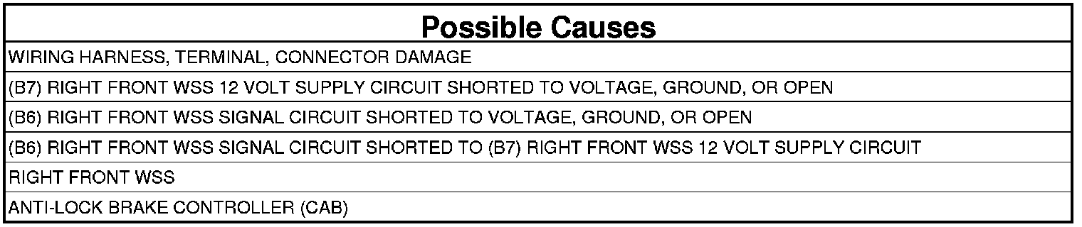 - Repair the (B6) Right Front WSS Signal circuit for a short to voltage.