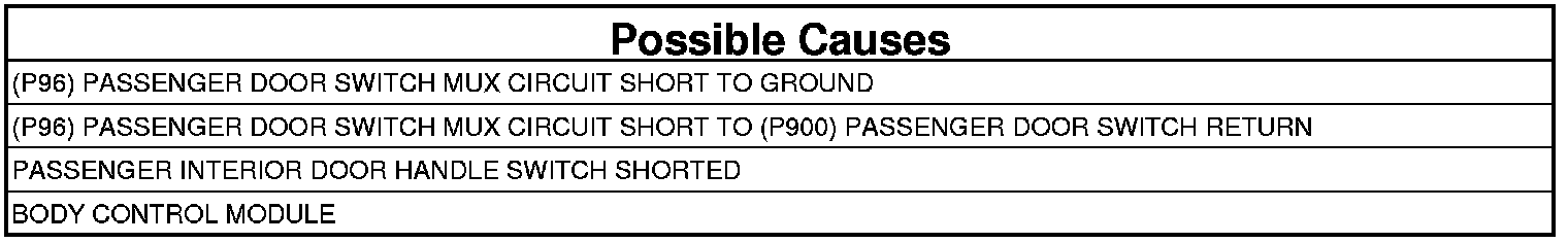 - Repair the (P96) Passenger Door Switch Mux circuit for a partial short to the (P900) Passenger Door Switch Return circuit.