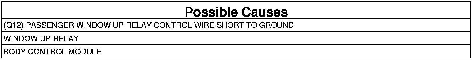 - Repair the (Q12) Passenger Window Up Relay Control circuit for a short to ground.