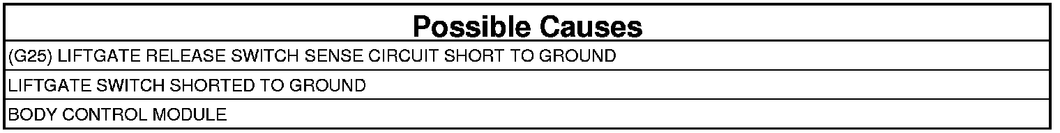 - Repair the (G25) Liftgate Release Switch Sense circuit for a short to ground.