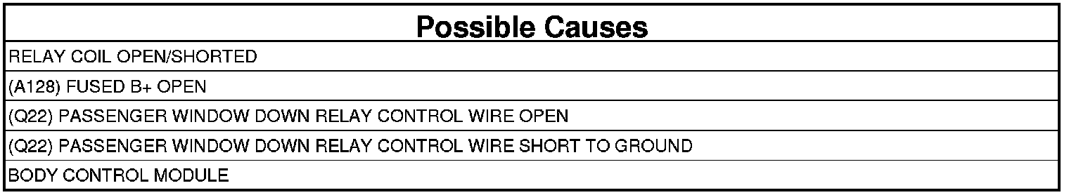 - Repair the (Q22) Passenger Window Down Relay Control circuit for an open.