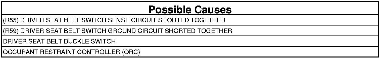 When powered, the Occupant Restraint Controller (ORC) sends a test current across the Passenger Seat Belt Switch circuits every 60 ms to verify the integrity of the switch and wiring. The DTC will set if the circuits are shorted together for 2.5 seconds and the code will transitions from active to stored when the current return to normal range for 5 seconds.