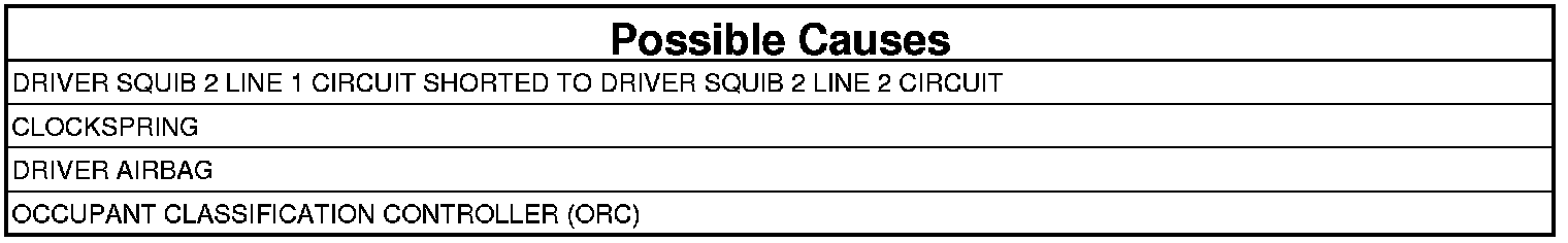 The Occupant Restraint Controller (ORC) monitors the resistance of the Driver Squib 2 circuits. The ORC will set this DTC if low resistance between the Driver Squib 2 circuits is detected.