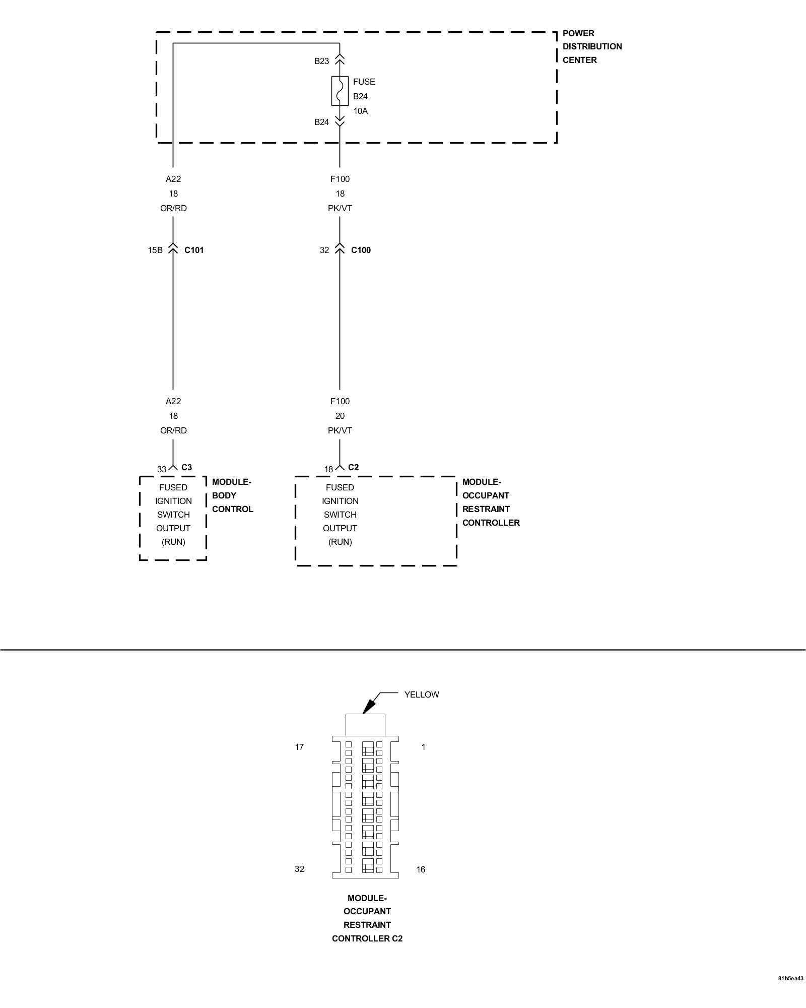 The Occupant Restraint Controller module (ORC) receives power from both a run/start and run only ignition supply circuits. These circuits power the ORC and the capacitors used to initiate the squib deployment circuits in the event of collision detection. If the voltage on the Fused Ignition Switch Output RUN circuit is below 6.0 volt the DTC will be set active.