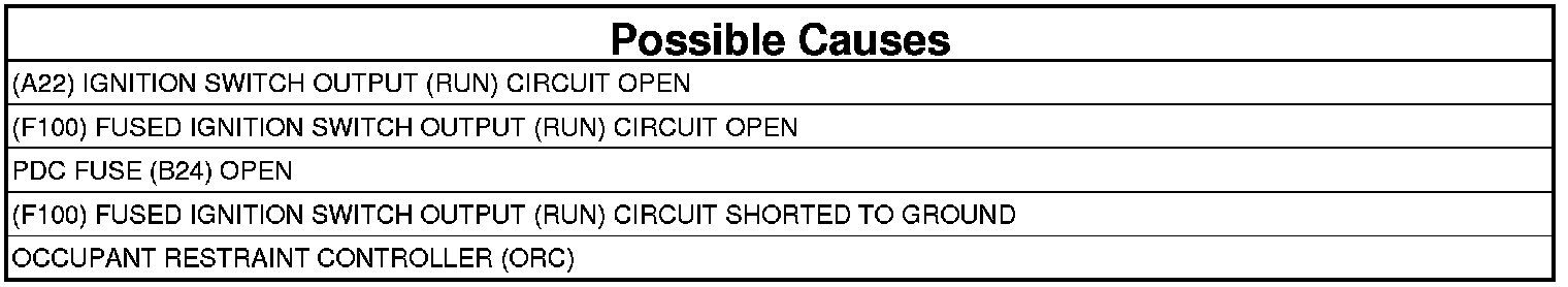 The Occupant Restraint Controller (ORC) monitors the voltage of the (F100) Fused Ignition Switch Output (Run) circuit and will set this DTC if it drops below approximately 6.0 volts.