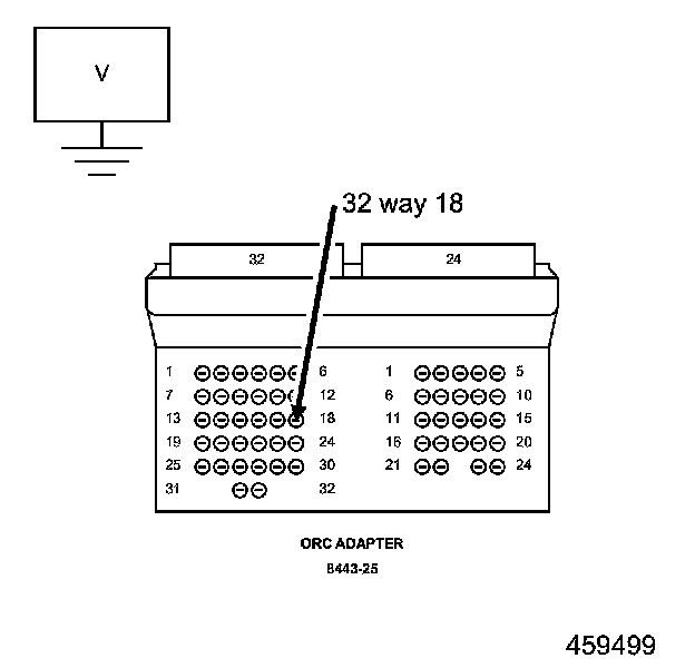 3. Measure the voltage of the (F100) Fused Ignition Switch Output (Run) Only circuit between the Load Tool 8443-25 Adaptor cavity 32 way-18 and ground.