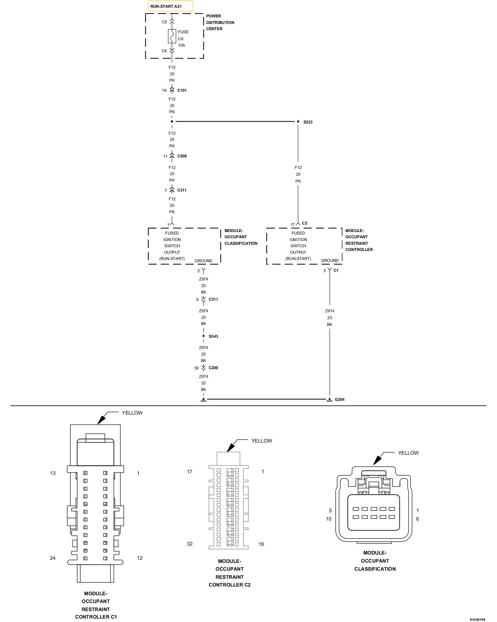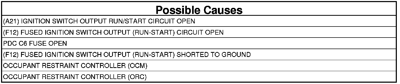The Occupant Restraint Controller module (ORC) receives power from both a run/start and run only ignition supply circuits. These circuits power the ORC and the capacitors used to initiate the squib deployment circuits in the event of collision detection. The OCM A21 Run/Start circuit provides battery voltage to the PDC C6 Fuse and the F12 Fused Ignition Switch Output Switch Run/Start circuit. If the voltage on the Fused Ignition Switch Output Run/Start circuit is below 6.0 volt the DTC will be set active.