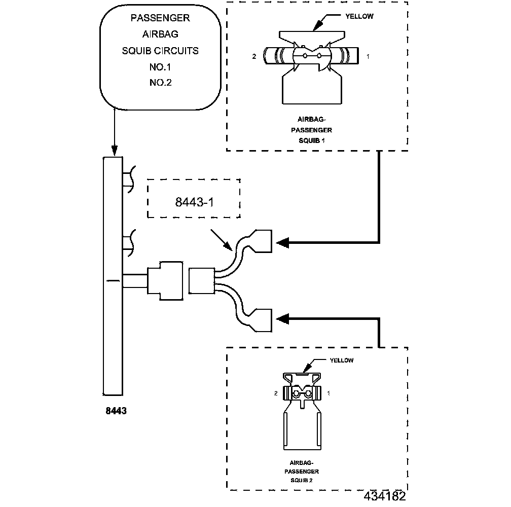 1. Measure the resistance of the Passenger Squib 1 Line 1 circuit between the Passenger Airbag Squib connector and the 8443 ORC Adaptor.