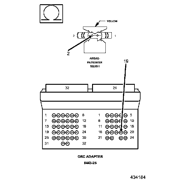 4. Measure the resistance of the Passenger Squib 1 Line 2 circuit between the Passenger Airbag Squib connector and the 8443 ORC Adaptor.