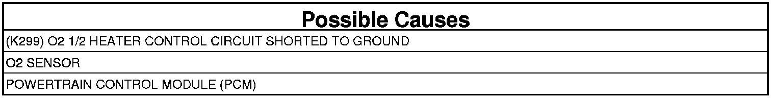 - Repair the short to ground in the (K299) O2 1/2 Heater Control circuit.
