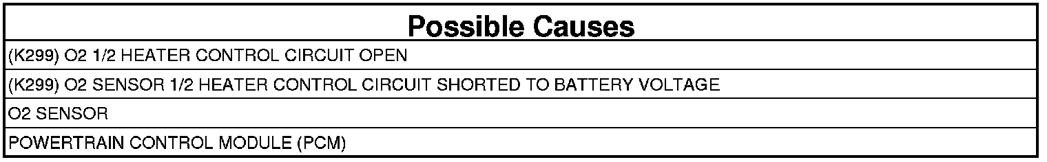 - Repair the short to battery voltage in the (K299) O2 1/2 Heater Control circuit.
