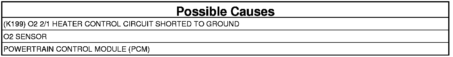 - Repair the short to ground in the (K199) O2 2/1 Sensor Heater Control circuit.