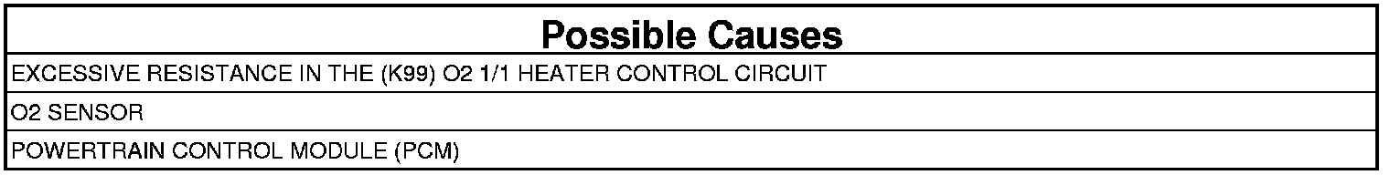- Repair the excessive resistance in the (K99) O2 1/1 Heater Control circuit.