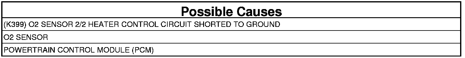 - Repair the short to ground in the (K399) O2 2/2 Sensor Heater Control circuit.