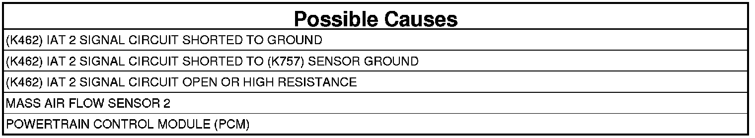 - Repair the (K462) IAT 2 Signal circuit for a short to the (K757) Sensor Ground circuit.