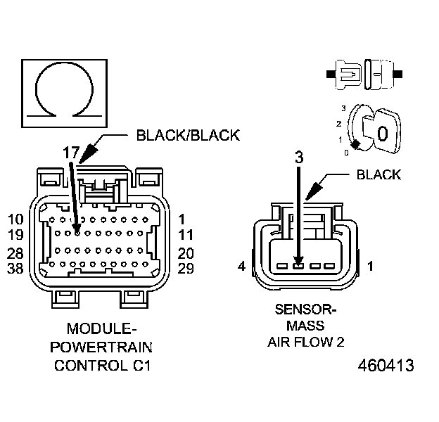 1. Using the wiring diagram/schematic as a guide, inspect the wiring and connectors between the Mass Air Flow Sensor 2 and the Powertrain Control Module (PCM).
