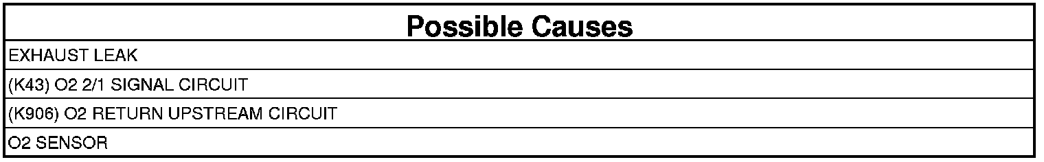 - Check the (K43) O2 2/1 Signal circuit for a short to ground, open, or short to voltage. If OK, replace and program the Powertrain Control Module.
