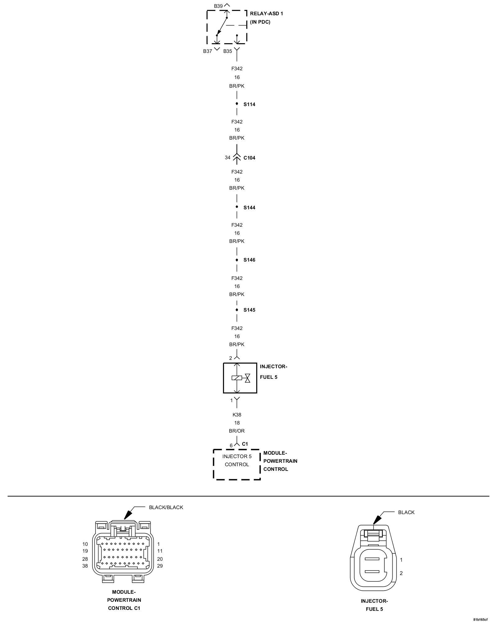 6. Using a 12 volt test light connected to ground, check the (K342) ASD Relay Output circuit in the Fuel Injector 5 harness connector.