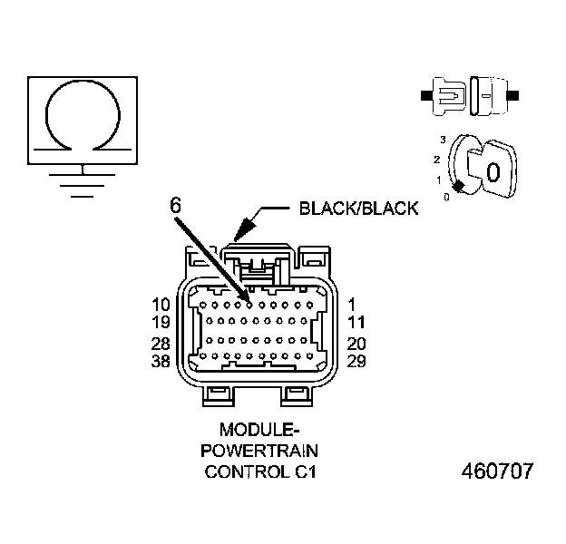 2. Measure the resistance between ground and the (K38) Injector 5 Control circuit at the Powertrain Control Module (PCM) harness connector.
