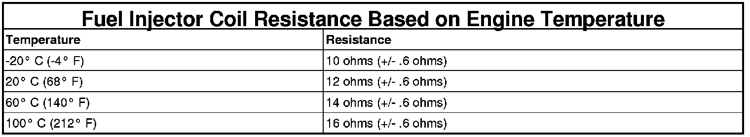 NOTE: The resistance of the circuit will vary according to the temperature of the injector coil. Use the table below to determine the resistance range of the injector.