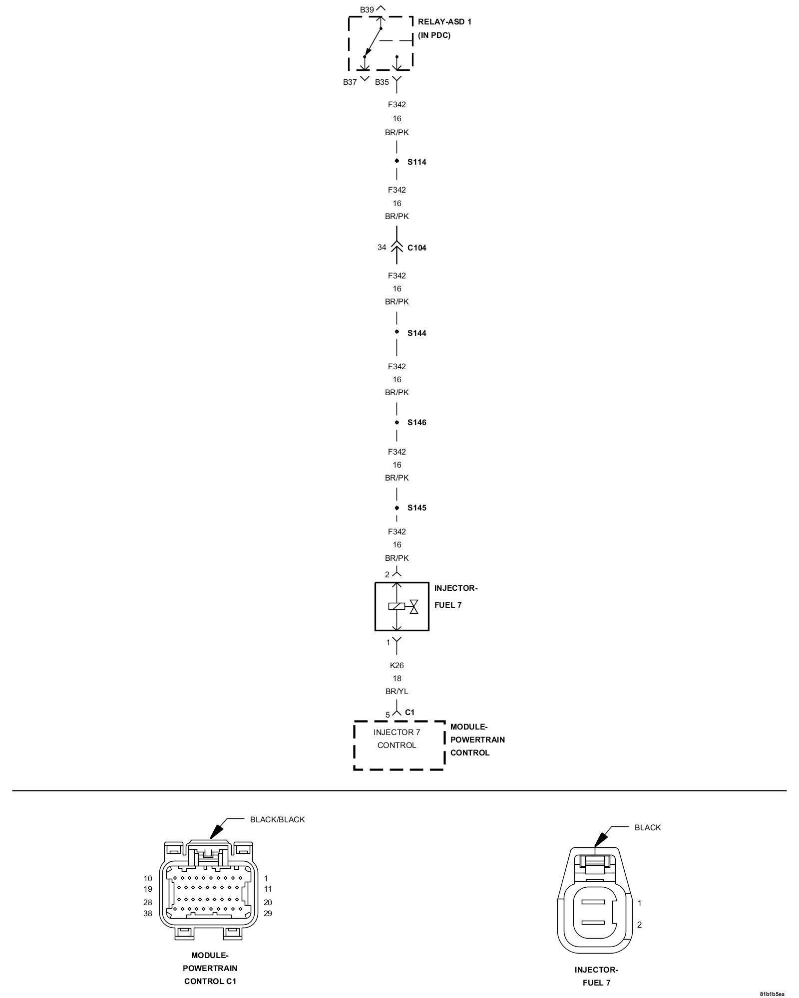 6. Using a 12 volt test light connected to ground, check the (K342) ASD Relay Output circuit in the Fuel Injector 7 harness connector.
