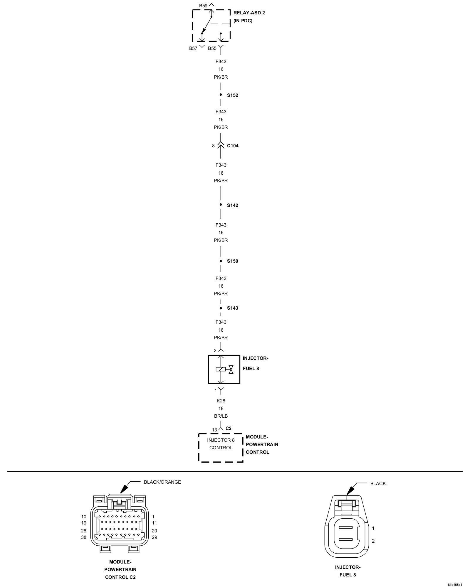 6. Using a 12 volt test light connected to ground, check the (K343) ASD Relay Output circuit in the Fuel Injector 8 harness connector.