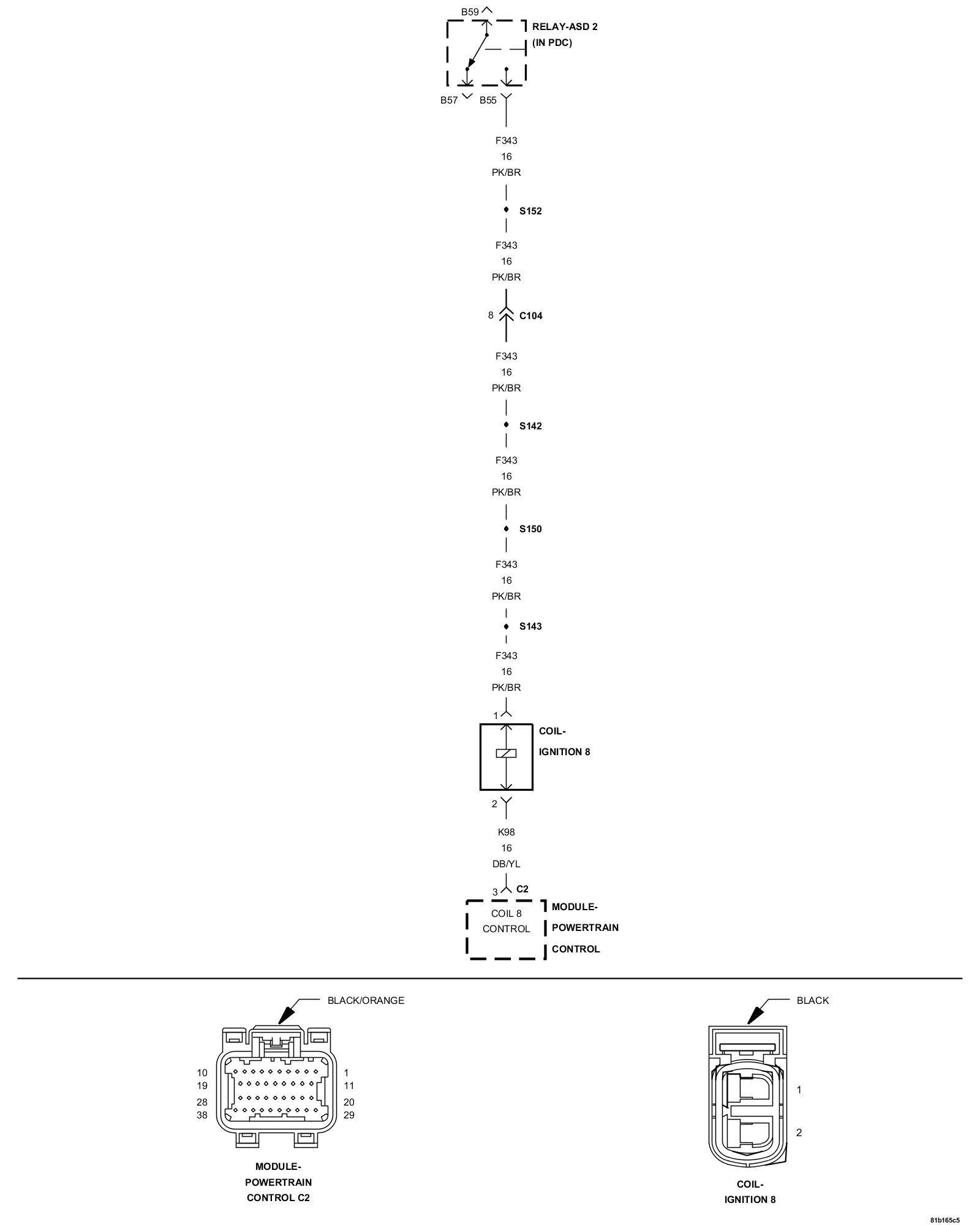 5. Using a 12 volt test light connected to ground, check the (K343) ASD Relay Output circuit in the Ignition Coil 8 harness connector.