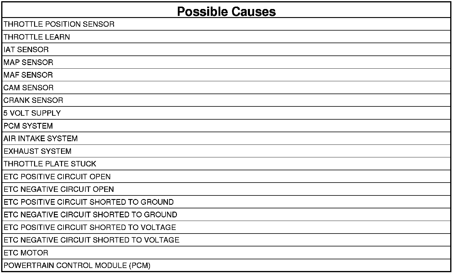 NOTE: Diagnose any TP Sensor, IAT Sensor, MAP Sensor, MAF Sensor, Camshaft Sensor, Crankshaft Sensor, 5-Volt Supply, Battery Voltage High, Battery Voltage Low, or any other DTCs before continuing with this diagnostic.