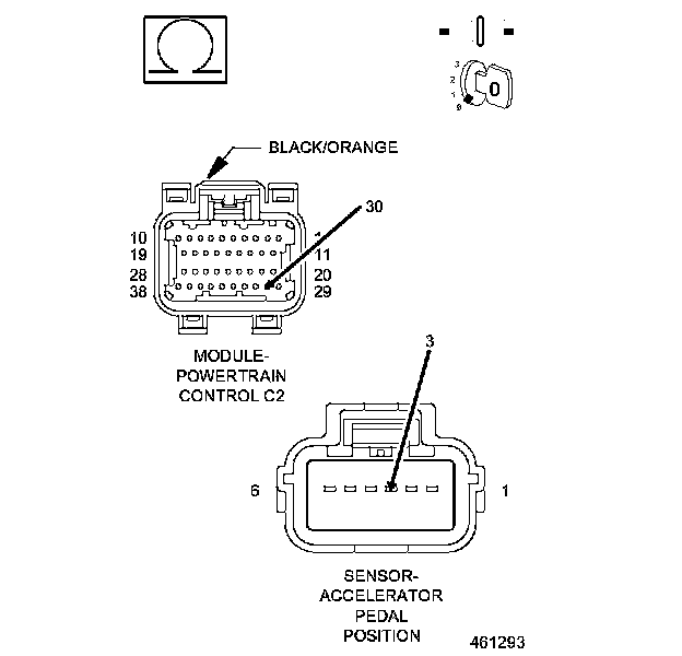 1. Using the wiring diagram/schematic as a guide, inspect the wiring and connectors between the Accelerator Pedal Position Sensor and the Powertrain Control Module (PCM).