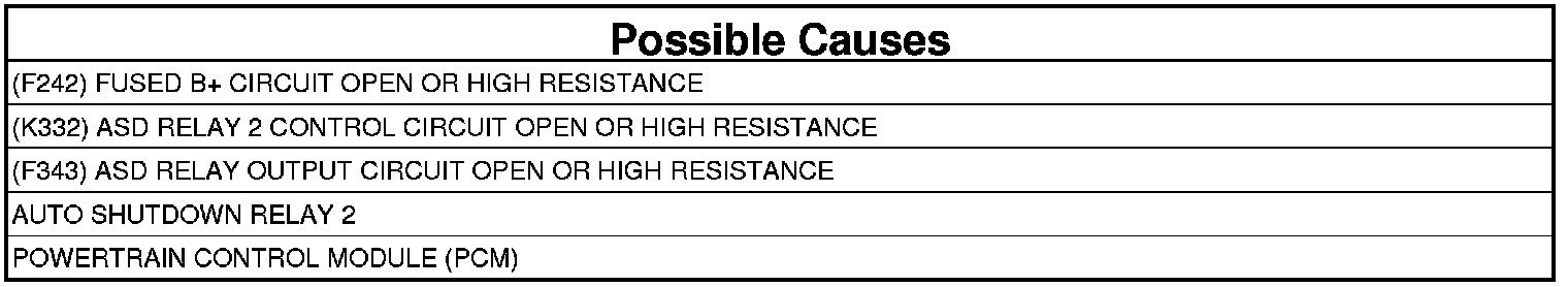With ignition on and engine running, or has run this ignition cycle. ASD Relay 2 is turned on. No diagnosed ASD Relay 2 voltage fault.