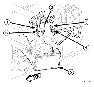 4. Install three chassis brake tubes (2, 4, 6) into the outlet ports in ICU (5). Tighten three brake tube nuts to 17 Nm (145 in. lbs.).