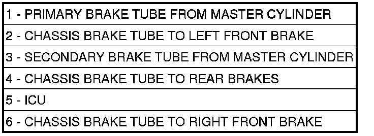 3. Install primary (1) and secondary (3) brake tubes from the master cylinder at ICU (5). Tighten primary and secondary brake tube nuts to 17 Nm (145 in. lbs.).