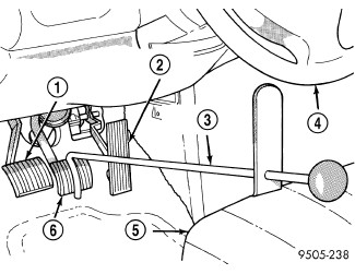 1. Using a brake pedal holder (3), depress the brake pedal (6) past its first one inch of travel and hold it in this position. This will isolate the master cylinder from the brake hydraulic system and will not allow the brake fluid to drain out of the master cylinder reservoir.