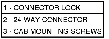 7. Pull outward on connector lock (1) and disconnect 24-way wiring connector (2) at CAB.