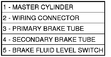 The brake fluid level switch (5) is located in the left side of the brake fluid reservoir on the master cylinder (1). It is clipped into the reservoir. It can be removed from the reservoir and replaced if necessary.
