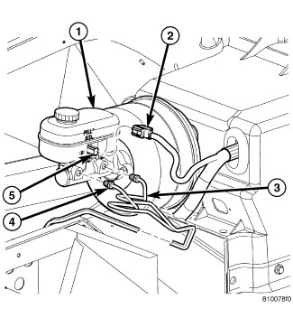 1. Align brake fluid level switch (5) with mounting hole on left side of master cylinder (1) brake fluid reservoir. Push switch into mounting hole until switch retaining tabs are expanded on opposite side of reservoir, locking it in place.