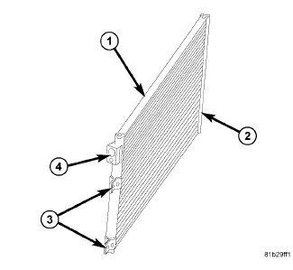 The A/C condenser is equipped with integral mounting provisions (3) and tapping blocks (2) for the refrigerant line connections.