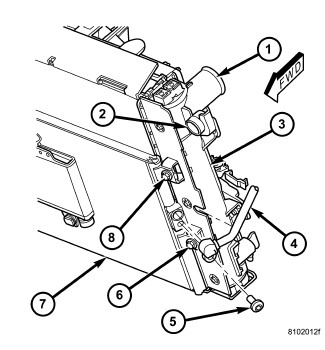 2. Install the bolts (6 and 8) that secure the driver side of the A/C condenser to the radiator (1). Tighten the bolts to 5 Nm (45 in. lbs.).