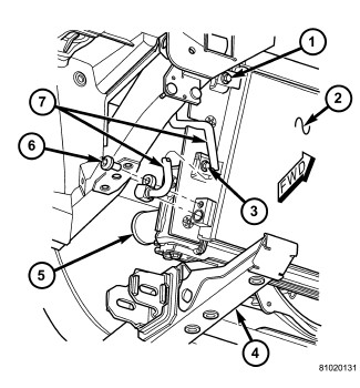 7. Install the bolt (5) that secures the A/C discharge to the A/C condenser. Tighten the bolt to 18 Nm (13 ft. lbs.).