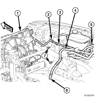 5. Install the bolt (5) that secures the A/C suction line to the A/C accumulator. Tighten the bolt to 18 Nm (13 ft. lbs.).